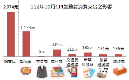 若以每月消費支出約7萬元之家庭為例,就10月CPI年增率2.96%而言,在購買相同品質與數量的商品及服務情況下,平均消費支出會較上年同月增加2,074元;七大類中食物類因蔬菜、水果及外食費價格上漲而增加1,173元,居住類因住宅維修費等價格上漲而增加334元。