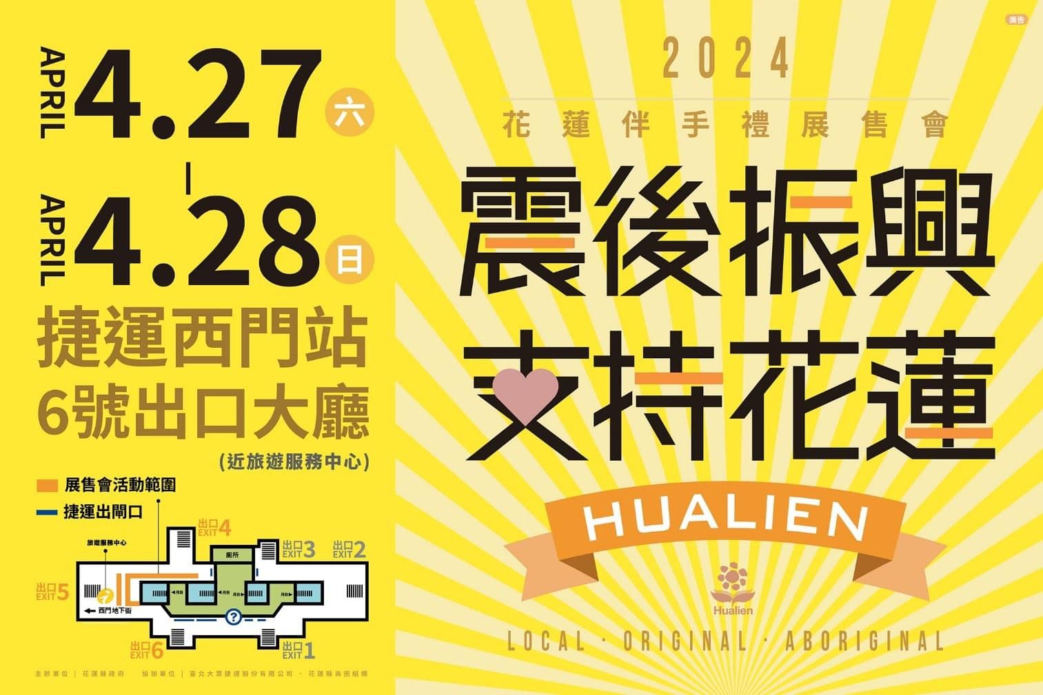 0403花蓮強震重創觀光相關產業,花蓮縣政府為振興商圈經濟,4月27日(六)、4月28日(日)將帶領花蓮縣商圈組織到台北捷運西門站6號出口大廳辦理「震後振興,花蓮依然安好!」花蓮特色伴手禮展售會,邀請大家前來以實際行動支持花蓮!