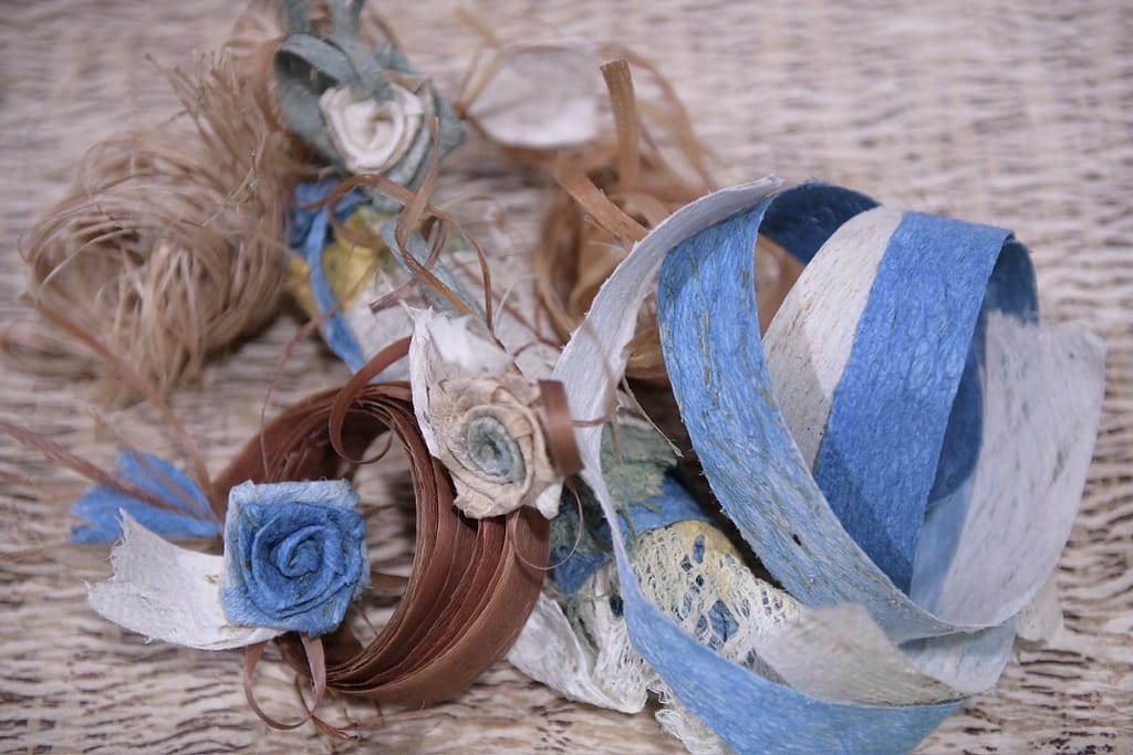 「迴響山海間 南島藝術與工藝展」,展示來自花蓮豐濱鄉的Lala Ban噶瑪蘭族新社香蕉絲工坊提供了18件作品,其中包括由工藝師嚴玉英為2024年巴黎奧運開幕式打造的運動員配件-腰帶和鞋面,這不僅是對中華健兒的祝福與平安,也向國際展示了香蕉絲編織的精湛技藝。