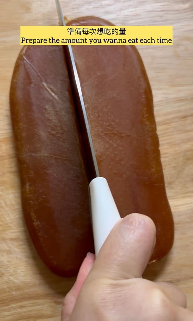 問到蔡爸,許多人不知道烏魚子怎麼料理?他說他吃烏魚子幾十年了,最喜歡的還是原味的吃法,也跟我們分享他獨門的料理方式。首先,烏魚子不管是否用炭烤,都一定要先用熱水燙過才會熟,放進熱水約2-3分鐘,取出後過一下冷水,之後將表面擦乾,再放進冷凍庫約10分鐘,取出後會發現烏魚子變得很好切,當然美味的烏魚子也完成了!