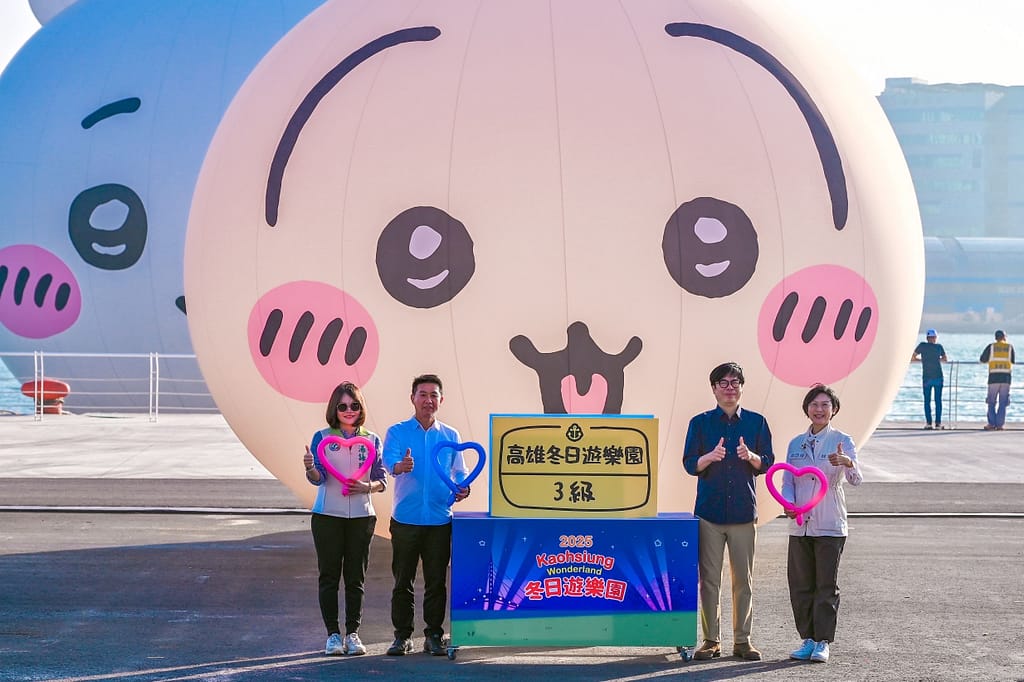 「2025 Kaohsiung Wonderland 高雄冬日遊樂園」從上(1)月25日正式登場以來吸引大小朋友共襄盛舉,今(16)日吉伊卡哇與小八貓再度游回高雄港17號碼頭,與兔兔合體向大家道別。高雄市長陳其邁率領市府團隊出席,並頒發「高雄冬日遊樂園3級檢定證照」給三位小可愛,感謝他們的參與。