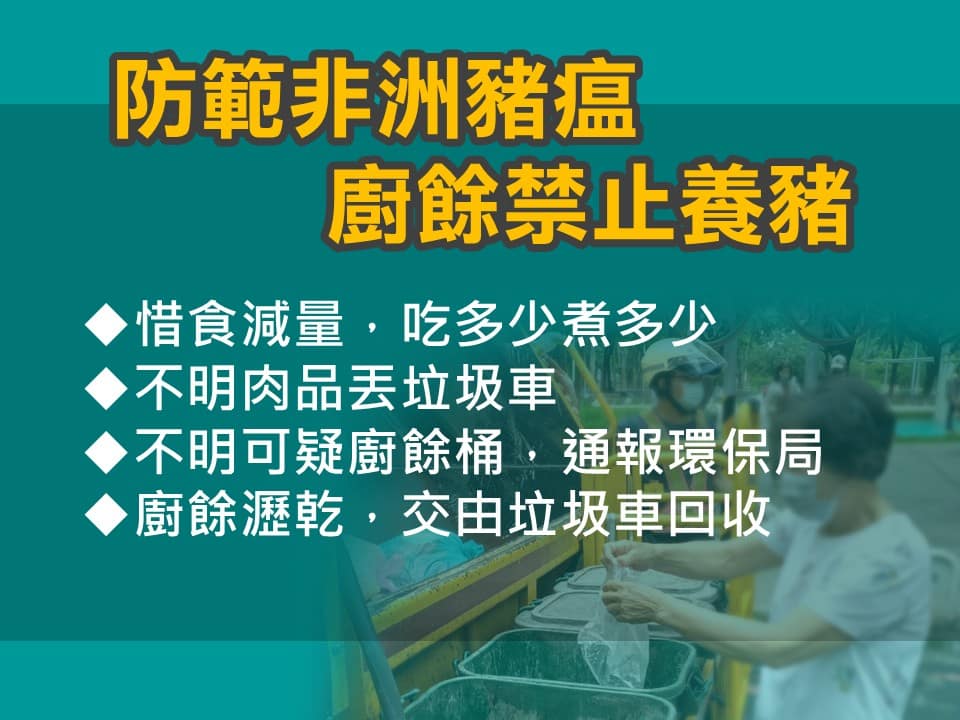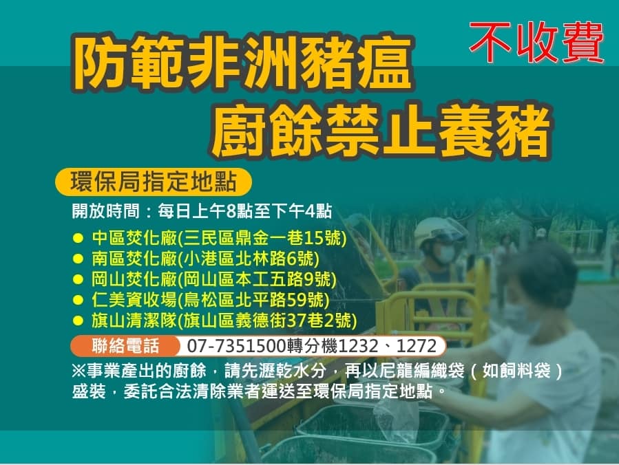 因應非洲豬瘟疫情,中央災害應變中心於10月22日宣布全面禁止以廚餘餵養豬隻。高雄市政府即日起全面配合中央政策,自10月22日起禁止廚餘養豬,所有廚餘將由高雄市環保局統一回收與處理。