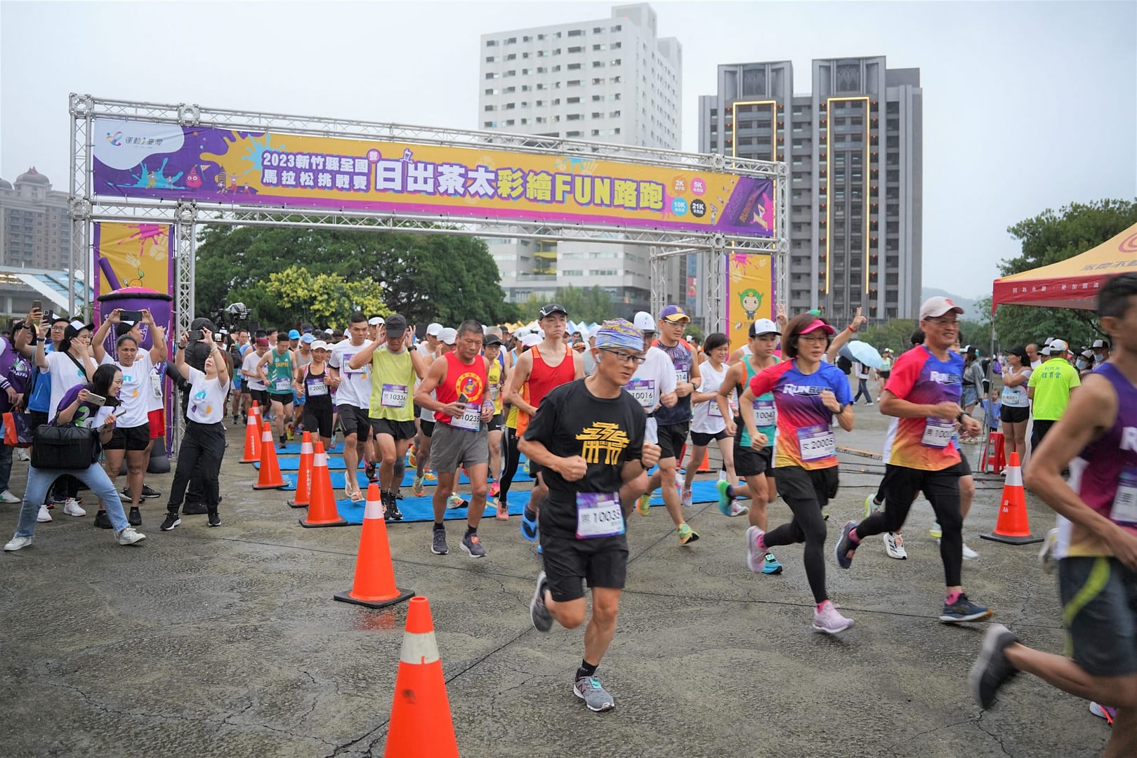 由新竹縣政府主辦、新竹縣體育會承辦的「2023新竹縣全國馬拉松挑戰賽暨日出茶太彩繪Fun路跑」今天(28日)一早正式開跑,新竹縣政府副縣長陳見賢代表縣長楊文科出席,教育局局長楊郡慈及縣議員林禹佑、副議長王炳漢秘書、多名竹北市民代表等人親自參與,鼓勵民眾培養運動的好習慣、體會路跑樂趣。