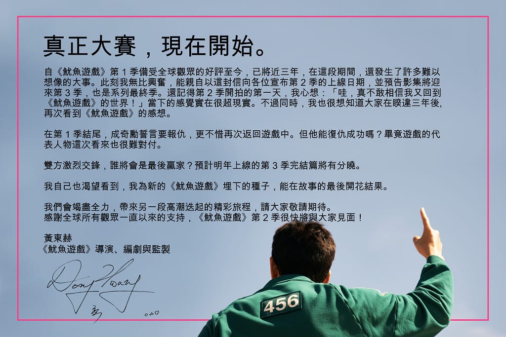 國際串流平台Netflix今(1)日確定魷魚遊戲全新一季將在12/26上線,而系列最終季將於2025年和觀眾見面,「魷魚遊戲」導演黃東赫更以親筆信預告:「真正大賽,現在開始。」