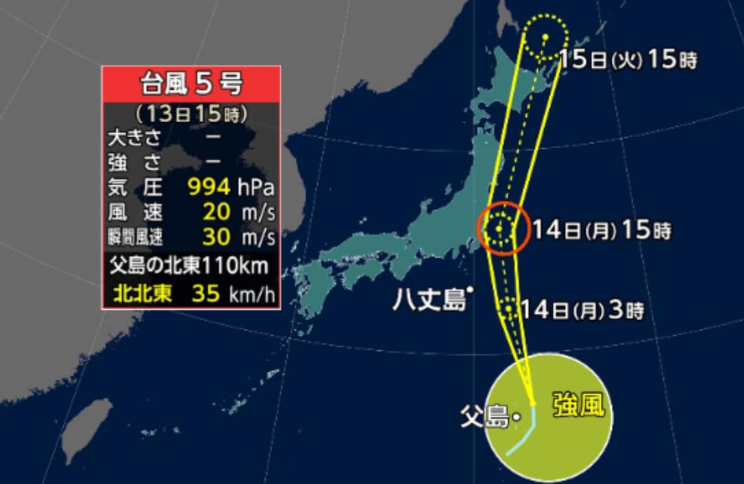 氣象廳表示,預計第5號颱風將持續發展,並在14日接近日本關東與東北沿海地區。受颱風外圍環流影響,關東地區、伊豆諸島、東北地區14日起恐出現暴雨及雷雨,山區與河川下游應警惕土石流與水位暴漲。
