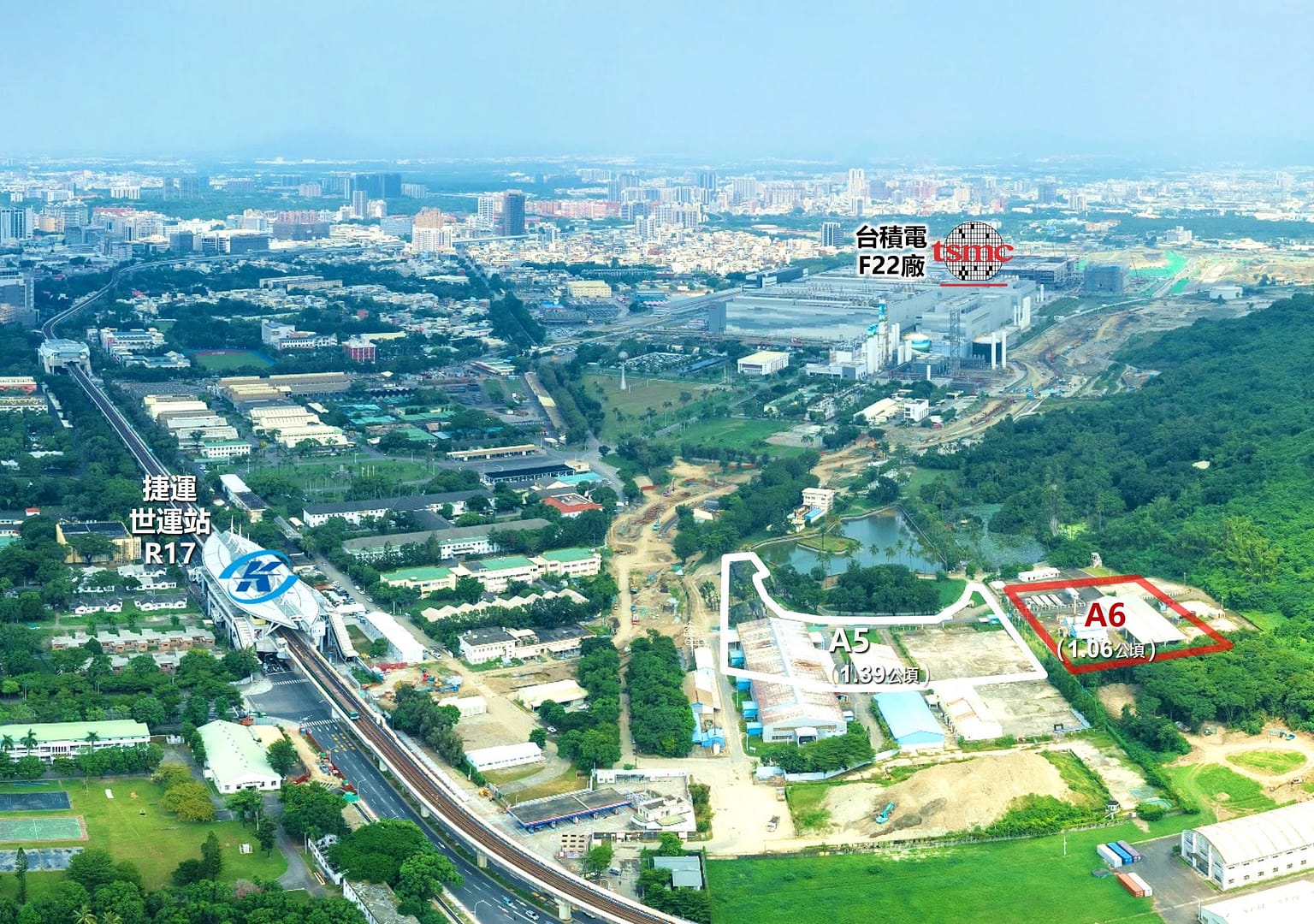 都發局表示,南部半導體S廊帶已成高雄產業發展主軸,為了滿足台積電與上下游進駐企業的商辦、研發及人才安家需求,讓企業進入高雄時能同步取得完整產業生活支援空間,市府接續在世運場站A5與A6基地辦理招商開發。