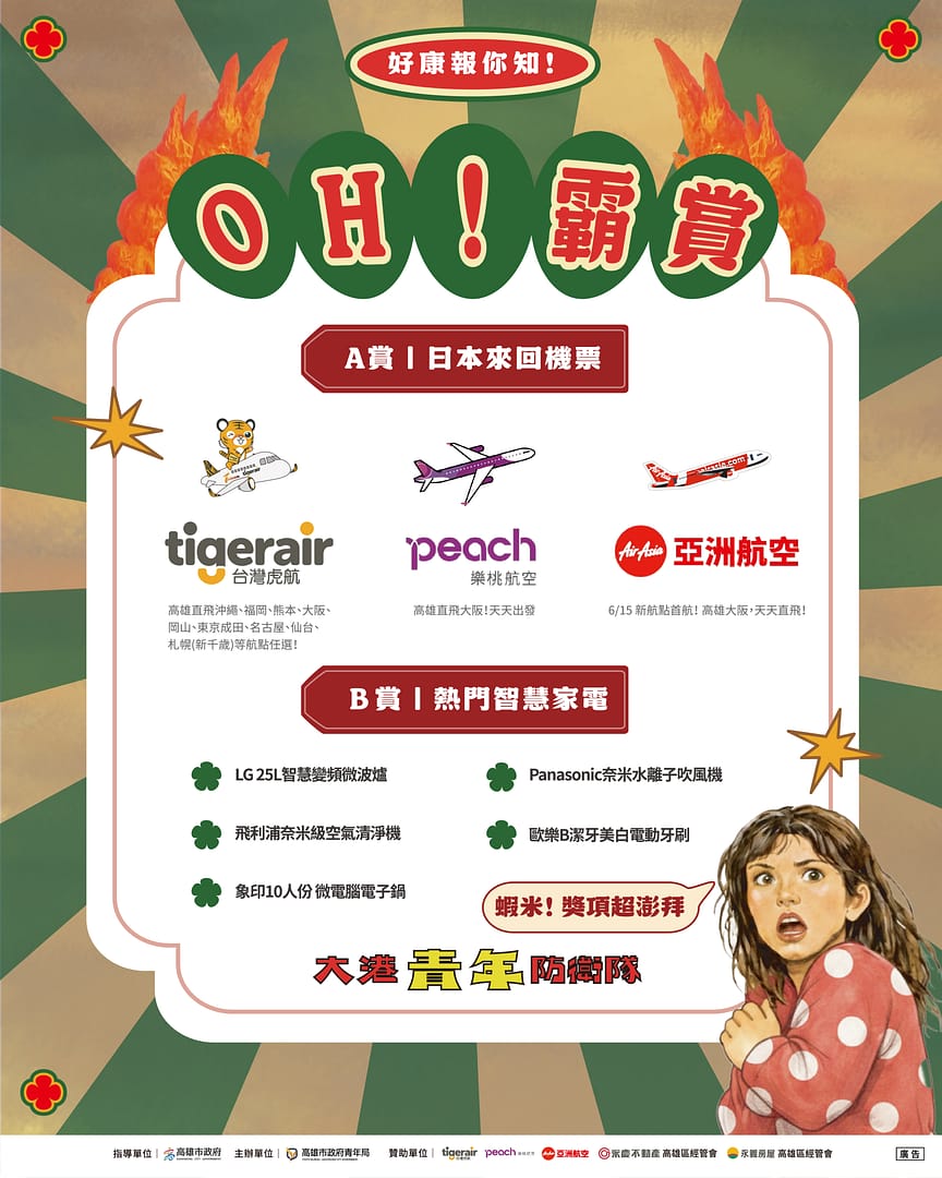 為極大化活動聲量,本次「OH!霸賞」攜手台灣虎航、樂桃航空及AirAsia亞洲航空,大方送出12套「高雄-日本」來回機票。台灣虎航提供高雄直飛沖繩、福岡、東京、札幌(新千歲)等熱門航點任選;樂桃航空提供每日高雄直飛大阪航線;AirAsia亞洲航空則帶來6月15日首航、每日高雄直飛大阪的新航線。此外,活動亦獲得永慶不動產、永義房屋支持,加碼20組熱門家電及超人力霸王限定週邊,總計多達6,000份獎項。