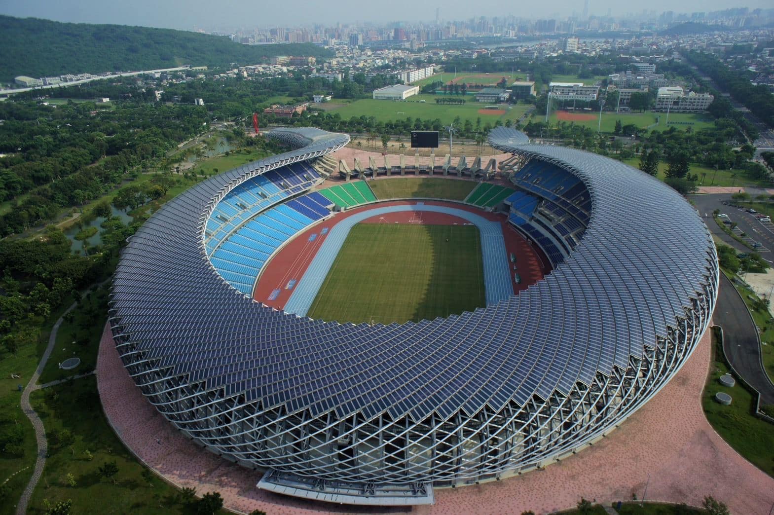 設計規劃國體場的劉培森建築事務所表示,高雄國家體育場由日本建築大師伊東豊雄設計,利用南台灣日照充足的地理環境優勢,導入建築整合太陽能光電板(BIPV)的概念,將8,844片太陽能板安裝在建物的屋頂結構體上,年發電量高達110萬度,年減少二氧化碳排放量達660噸。同時也利用屋頂及草地進行雨水收集,場地水箱內設有13,000噸雨水儲存槽,作為園區內的綠化澆灌使用,以此達到水循環資源再利用的效果。