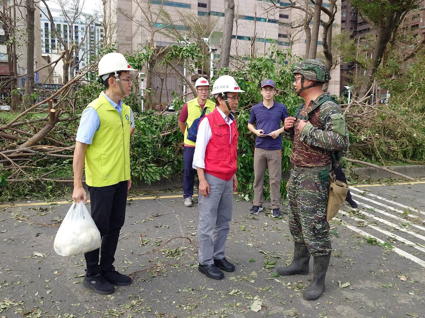 林欽榮副市長今日亦前往視察新光路、中山路、大中路等主要幹道樹倒伏排除情形,除慰勞第一線工務團隊辛勞及軍方及時增援外,並責成工務局需於明(5)日清晨之前優先搶通本市所有的市區幹道(包含主線道及慢車道)路樹傾倒的路障排除。