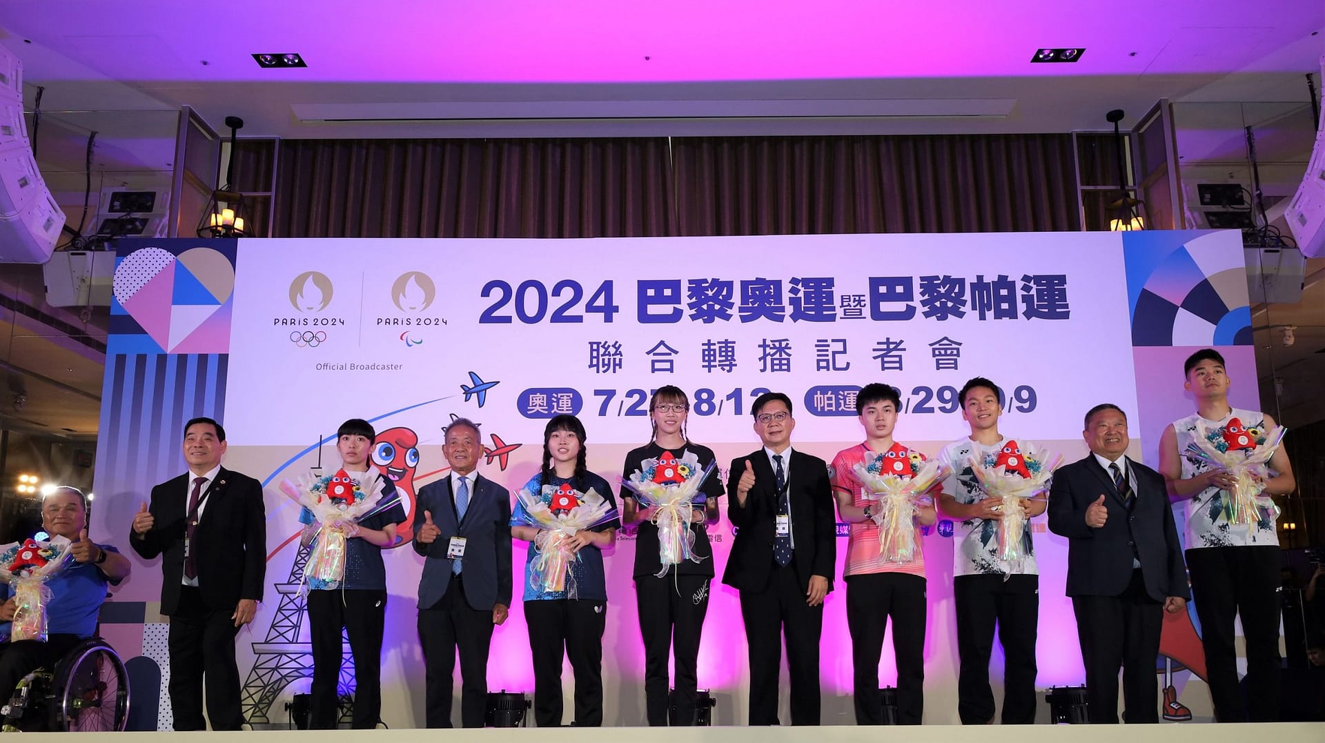2024 年奧林匹克運動會及帕拉林匹克運動會(以下稱巴黎奧運及帕運)將於 113 年 7 月 26 日至 8 月 11 日及113年8月28日至9月8日於法國巴黎舉辦,教育部體育署攜手愛爾達、中華電信、公視及華視召開聯合轉播記者會,教育部張廖萬堅政務次長、中華奧林匹克委員會林鴻道主席及教育部體育署鄭世忠署長均親臨致意,並邀請到本屆奧運選手王齊麟、李洋(羽球)、林昀儒(桌球)及黃筱雯(拳擊),帕運選手田曉雯、林姿妤(桌球)及曾隆輝(射箭)等多名選手一同出席站台。