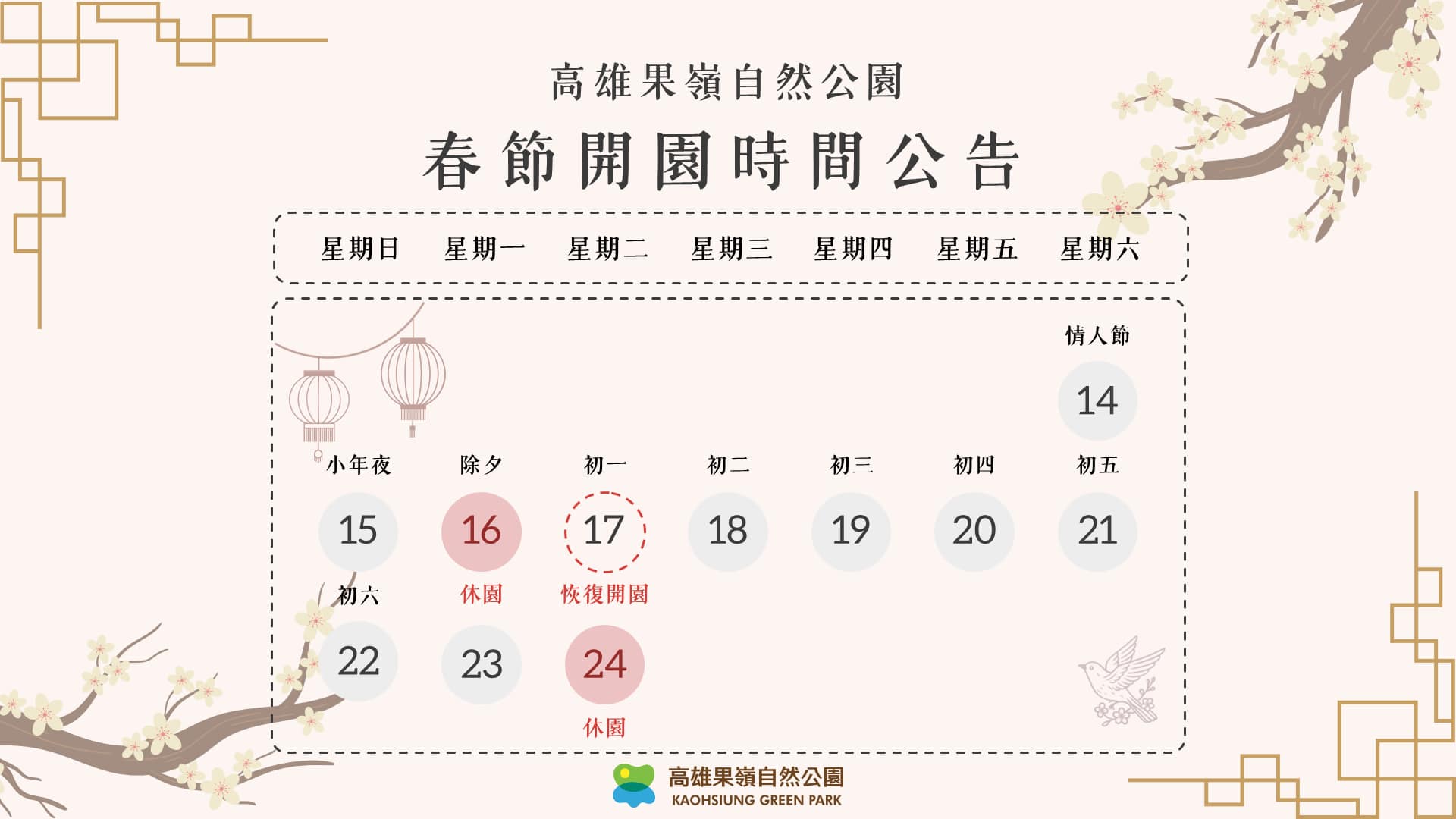 公園處指出,兩處園區將於2月16日(除夕)休園一天,自2月17日(大年初一)至2月22日(初六)全面開放。春節連假結束後,園區將恢復例行維護休園時段,澄清湖自2月23日(週一)起休園,高雄果嶺自然公園則自2月24日(週二)起恢復例行休園。