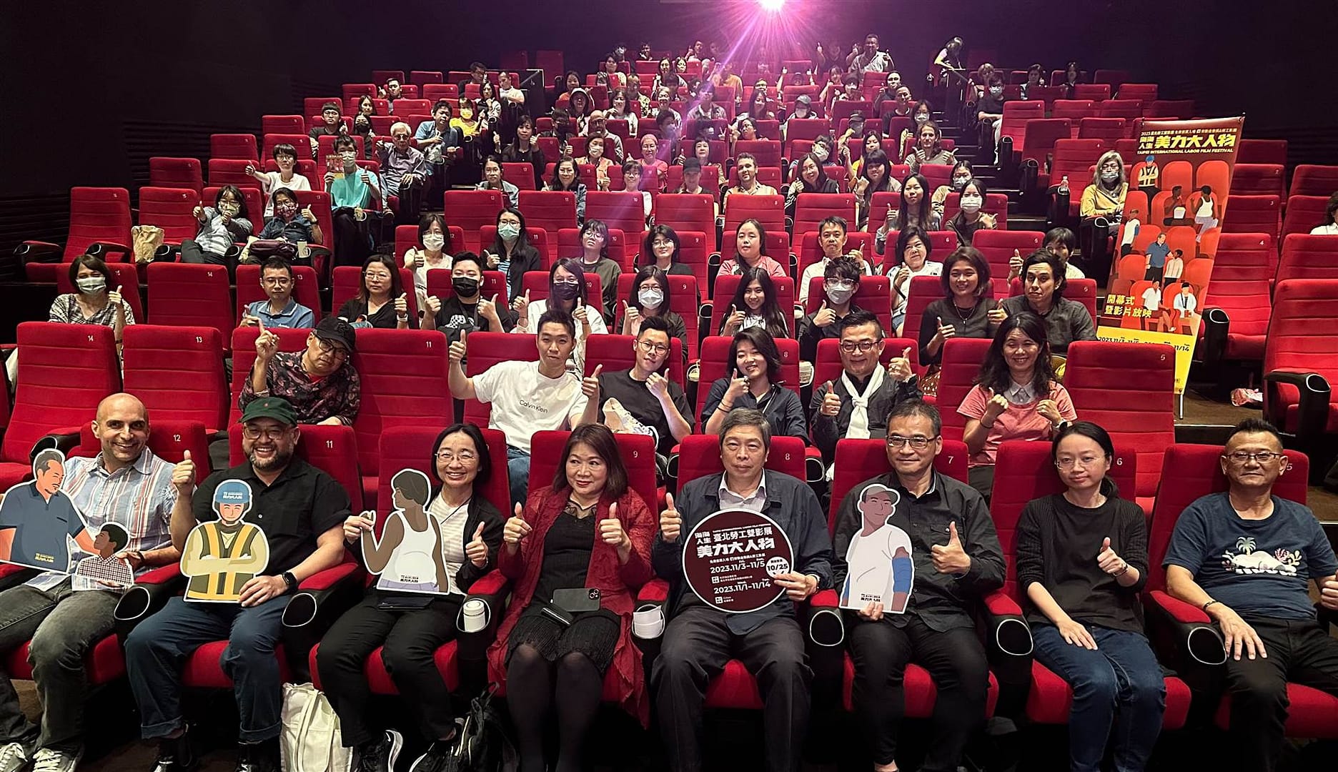 而出席映前座談的導演Joseph Mangat(潘宇綱),特別跟現場觀眾分享折翼姊妹的拍攝背景,以菲律賓國家對宗教文物的高度依賴及崇拜,與實際社會勞動態樣不同的反差為題裁,藉由這群工人日常群像,捕捉菲律賓人看似樂天、其實多愁善感的性格,一揭他們痴迷宗教文物的真正原因及性向與資本主義之於弱勢族群的欺壓與剥削;另於2022年以《神人之家》拿下台北電影獎百萬首獎、本屆勞工影展策展顧問的陳璽文導演,也現身談到義大利同樣為宗教盛地,相較臺灣是否有勞動群眾的不同外,特別顧及影展所需凸顯著眼於個人生活和工作間的平衡性,這是影視產業人員常面臨到極度兩難的困境。最後他更鼓勵⼤眾走進電影院觀賞他特別為大家精心挑選的經典好片,同時也希望影展能提醒我們透過影像引發對周遭勞動環境與權益的聚焦,並藉由分享討論進而產生共鳴。