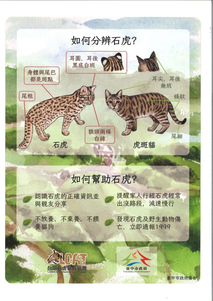 農業局表示,石虎為夜行性動物,體型似貓,額頭有二條白線、耳圓耳後黑底白斑、身體與尾巴都有深色斑點,在台中市主要分布於淺山地區及河川溪流河床,聯繫苗栗及南投二個重要石虎棲地。此次石虎發現地點近筏子溪流域周邊,根據農業局及林業及自然保育署台中分署調查,筏子溪及烏溪都有石虎蹤跡,籲請民眾夜間開車行經筏子溪及烏流域沿線道路應減速慢行,且不要任意餵食動物,以共同維護野生動物及用路安全。