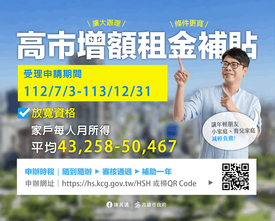 內政部300億擴大租金補貼專案自112年7月3日開辦以來,由於資格放寬及加碼補貼,迄今高雄市已有7.7萬餘戶提出申請,比111年度增加3萬餘戶,申請狀況踴躍。該專案採隨到隨辦方式辦理,將受理至113年12月31日下午5時止,只要年滿18歲並有簽訂租賃契約都可申請,也包括外地來高雄求學的租屋學生,減輕租屋負擔。