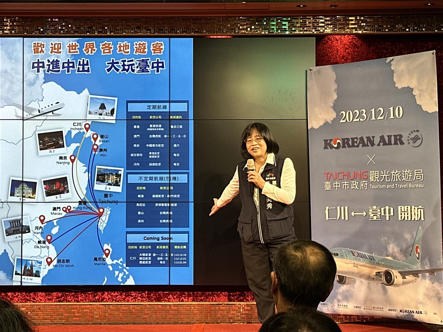 台中市政府觀光旅遊局長陳美秀、大韓航空台北分公司總經理徐旼廷,及交通部民用航空局台中航空站主任張瑞澍,一同在台灣大道市政大樓召開開航記者會,宣布將於12月10日迎來大韓航空「仁川台中」航線的韓國觀光客。